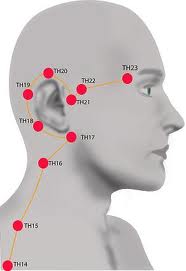 The triple burner system works through these 3 sections. The triple burner meridian starts at the ring finger, runs through the arms and shoulders, around the ears, and through the temples to the outer edge of the eyebrow.